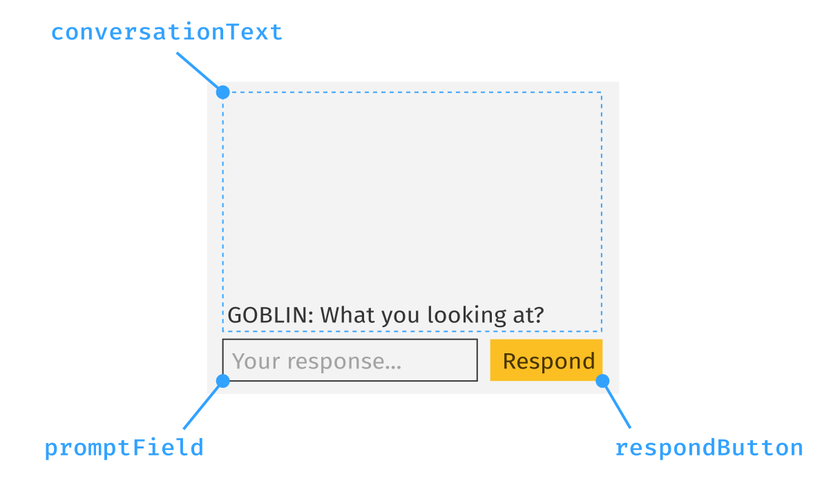 The NpcFacet has one public method RespondToPlayer which receives the current state of the conversation (NpcConversation) and the player prompt (string) and returns the new state of the conversation (the new last message from the goblin and its ID).